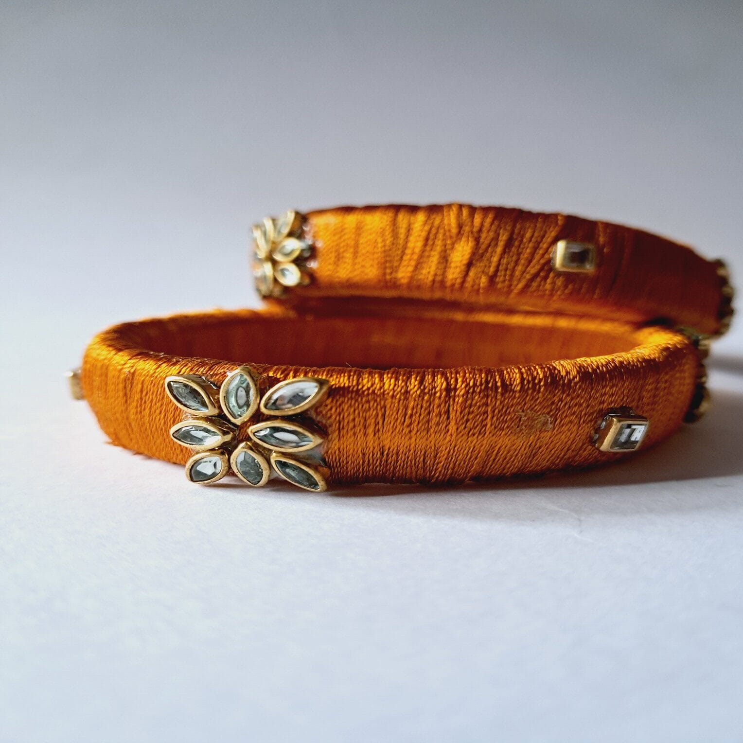 Add a touch of royal charm to your outfit with these exquisite golden silk thread bangles, featuring floral mirror embellishments and delicate square accents. These handcrafted bangles exude grace and sophistication, making them perfect for traditional and festive occasions.