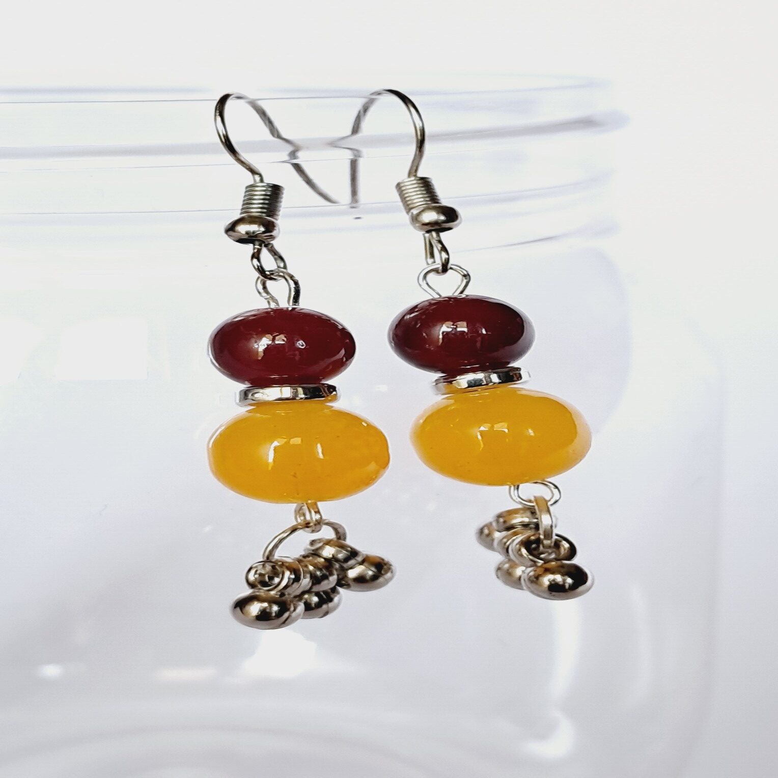 Brighten up your look with these handmade yellow and maroon beaded earrings. Featuring rich maroon beads, warm golden-yellow stones, and silver-tone jingle charms, these earrings add a sophisticated touch to any outfit.