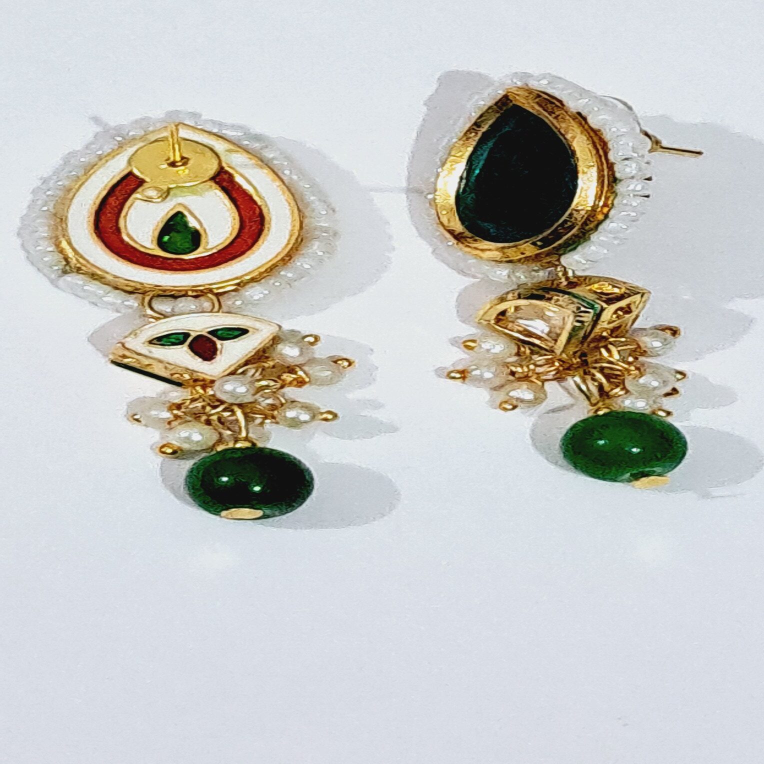 Add a touch of sophistication to your ethnic attire with these intricately designed Kundan earrings. Featuring a teardrop shape adorned with colorful enamel work, green beads, and delicate pearl accents, these earrings are perfect for weddings, festivals, and special occasions. Handmade with premium-quality materials, these earrings exude timeless charm and elegance.