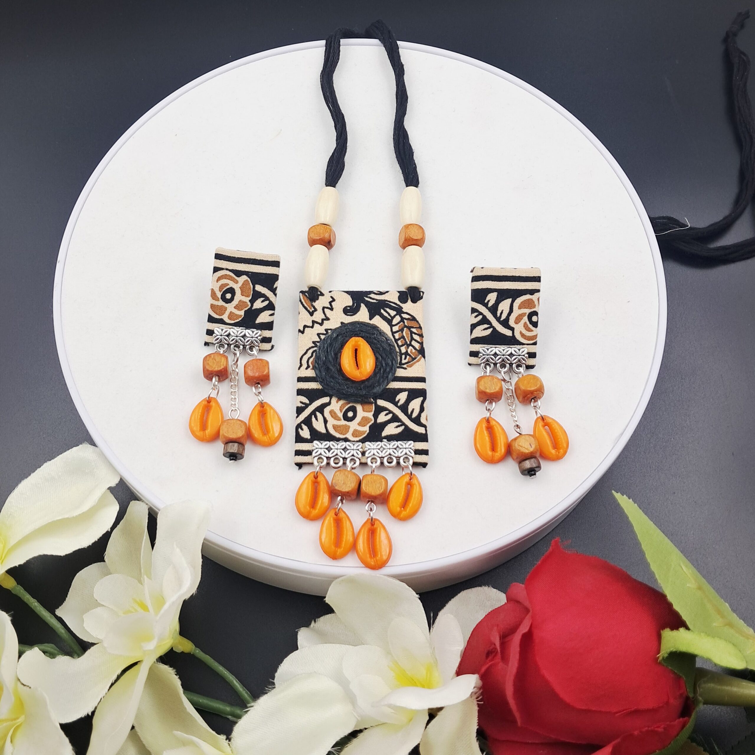 Add a touch of handcrafted elegance to your jewellery collection with these Handcrafted Black Fabric Stud Earrings. Designed with a bold yet graceful aesthetic, these earrings feature a soft black fabric base accented with a printed brown-black pattern, giving them a unique artisanal appeal.