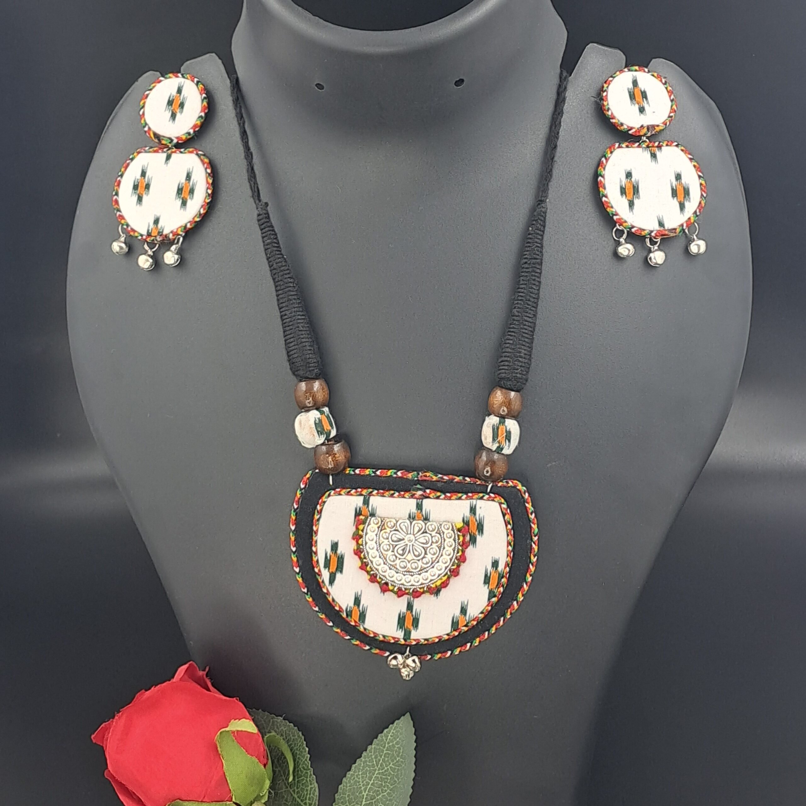 A handcrafted black and white fabric pendant necklace set featuring traditional ikat-inspired prints, wooden bead accents, and delicate ghungroo detailing. Comes with matching lightweight fabric earrings for a graceful ethnic look.