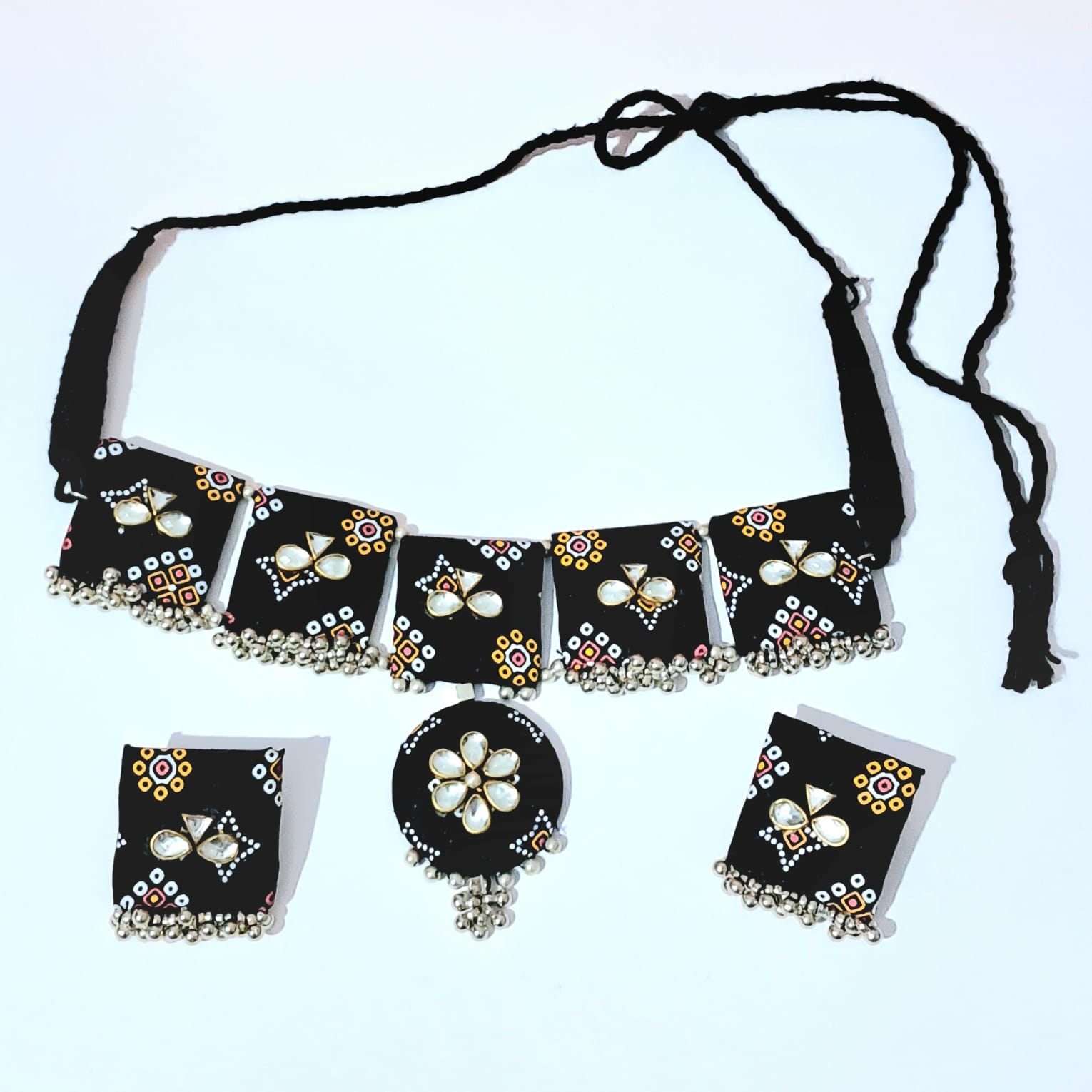 The set includes matching fabric earrings designed with the same traditional artwork and thread bead accents to create a coordinated and stylish look. Lightweight and comfortable, this jewelry set is perfect for festive celebrations, cultural events, casual ethnic styling, and Indo-western outfits.