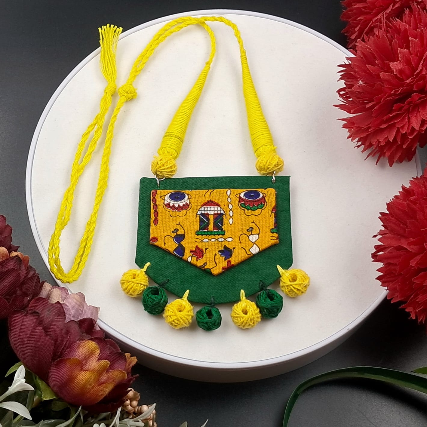 Celebrate traditional craftsmanship with this beautifully handcrafted yellow and green fabric necklace set inspired by colorful folk art designs. The necklace features a vibrant yellow thread cord paired with a unique fabric pendant decorated with traditional cultural motifs.