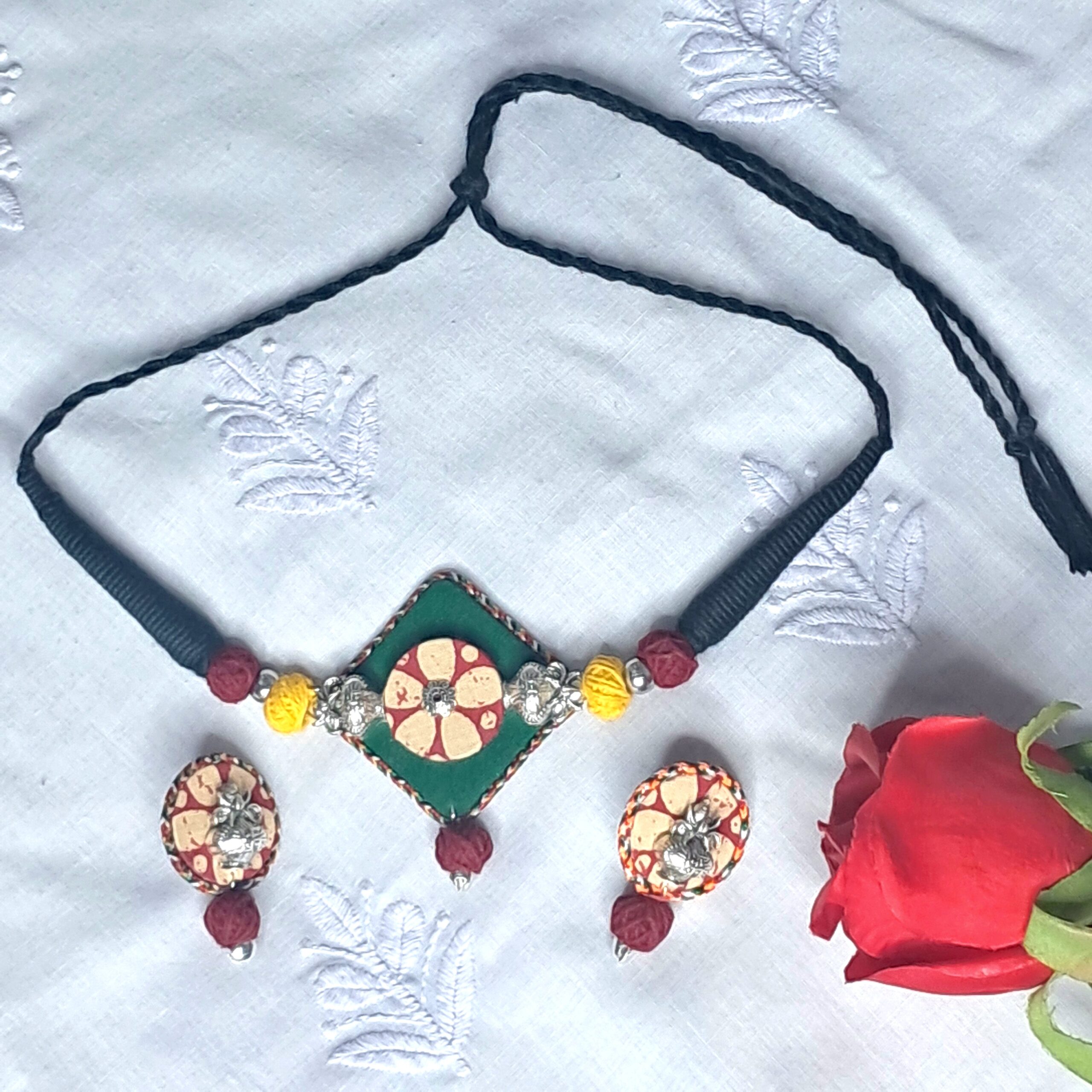 The set is completed with matching fabric earrings, designed to echo the pendant’s print and bead detailing. Lightweight, skin-friendly, and versatile, this jewellery set is ideal for daily wear, office styling, casual outings, or subtle festive occasions.
