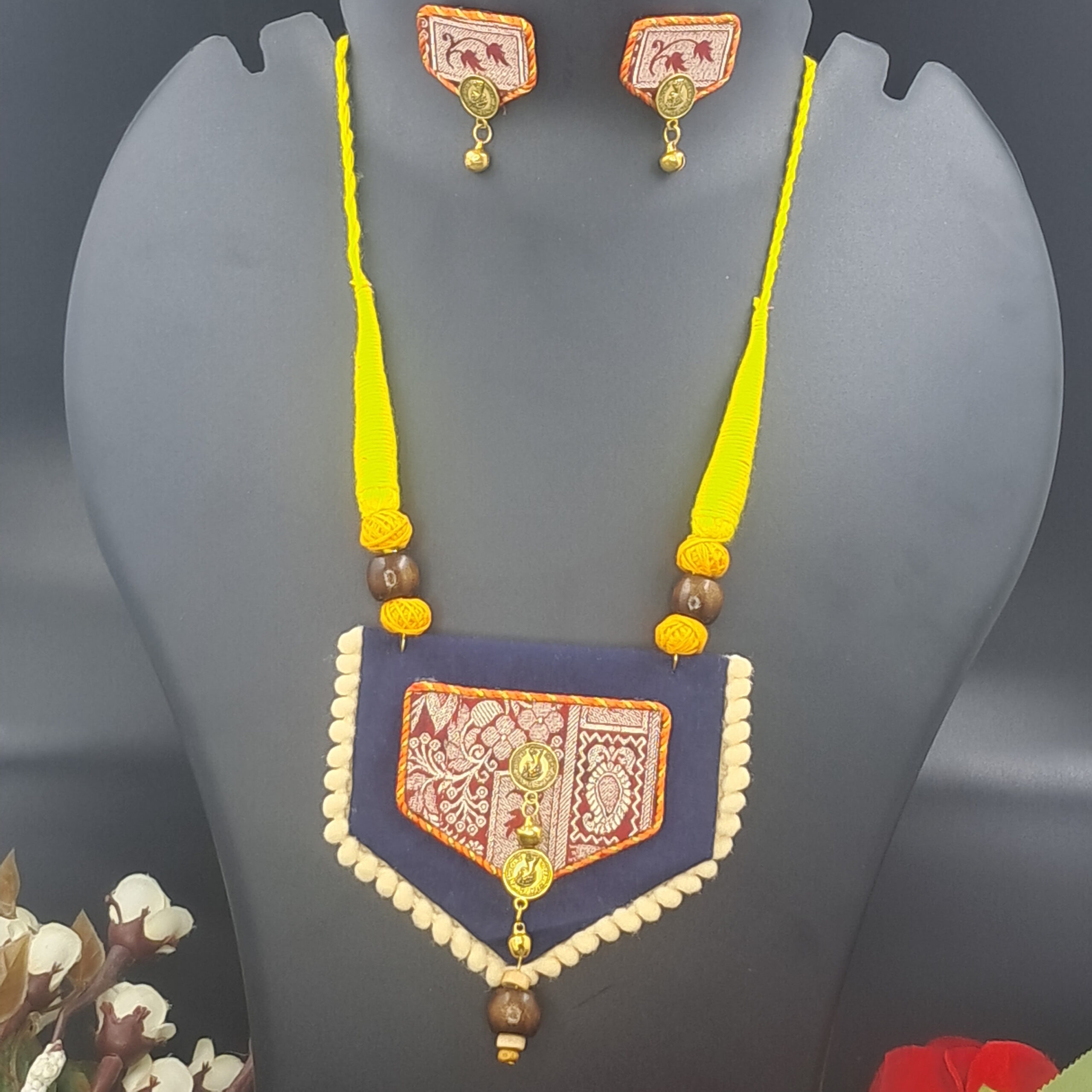 Handcrafted Navy Blue Fabric Pendant Necklace Set with Yellow Dori – JSFA0028