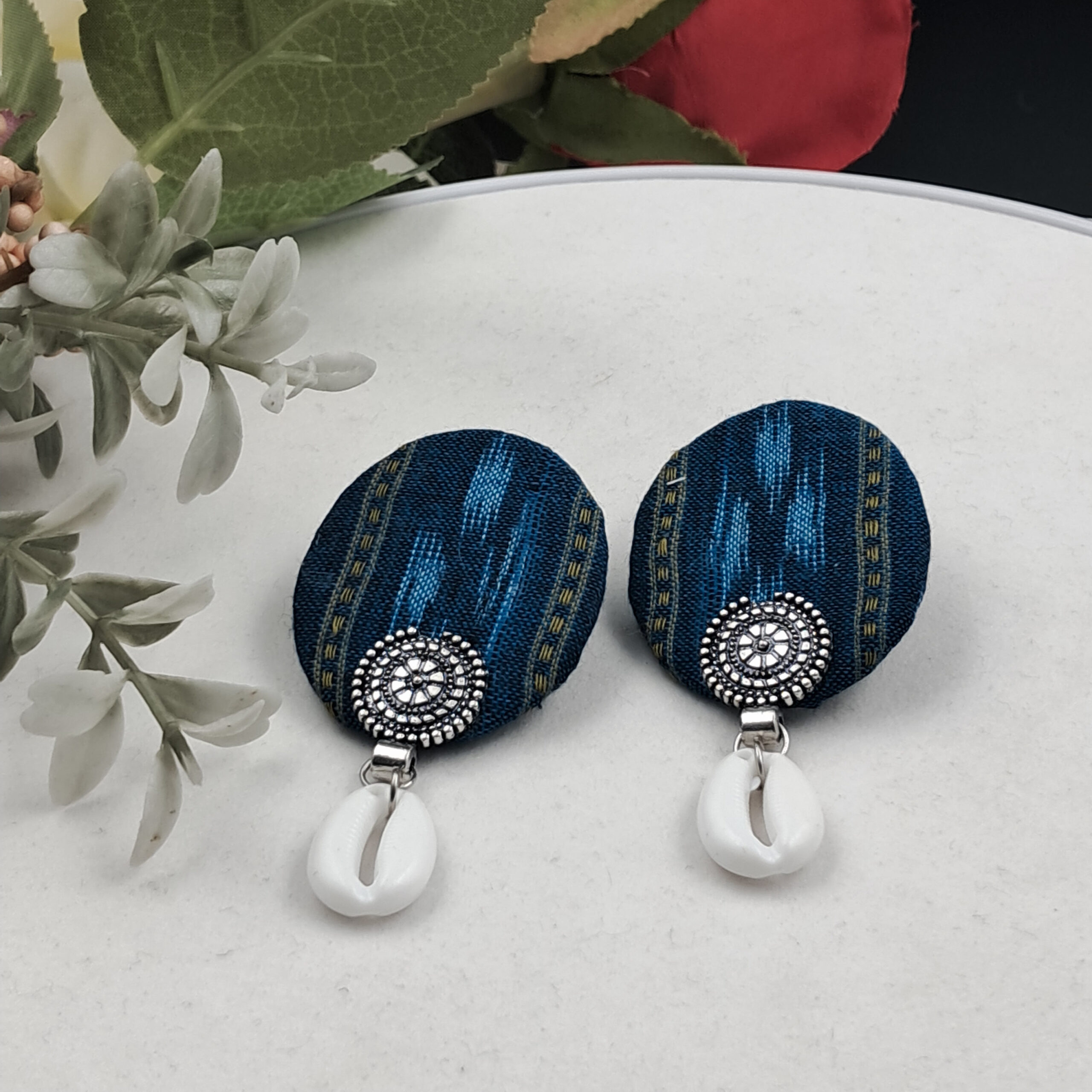 Beautifully handcrafted earrings featuring traditional Sambalpuri fabric, oxidised silver detailing, and a cowrie shell drop. Lightweight, elegant, and perfect for everyday ethnic or boho styling.