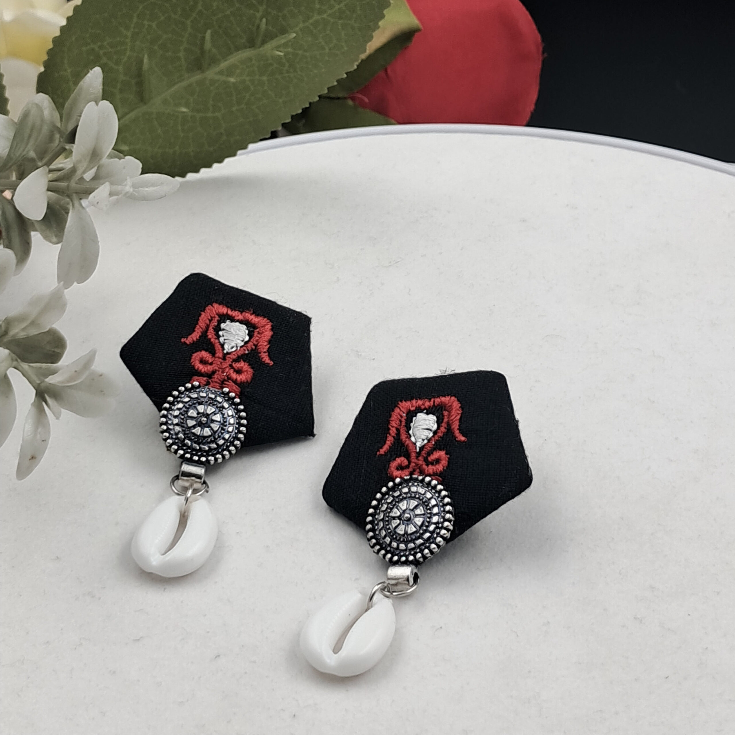 Handcrafted Sambalpuri Fabric Earrings with Oxidized Stud & Shell Drop – EAFA0046