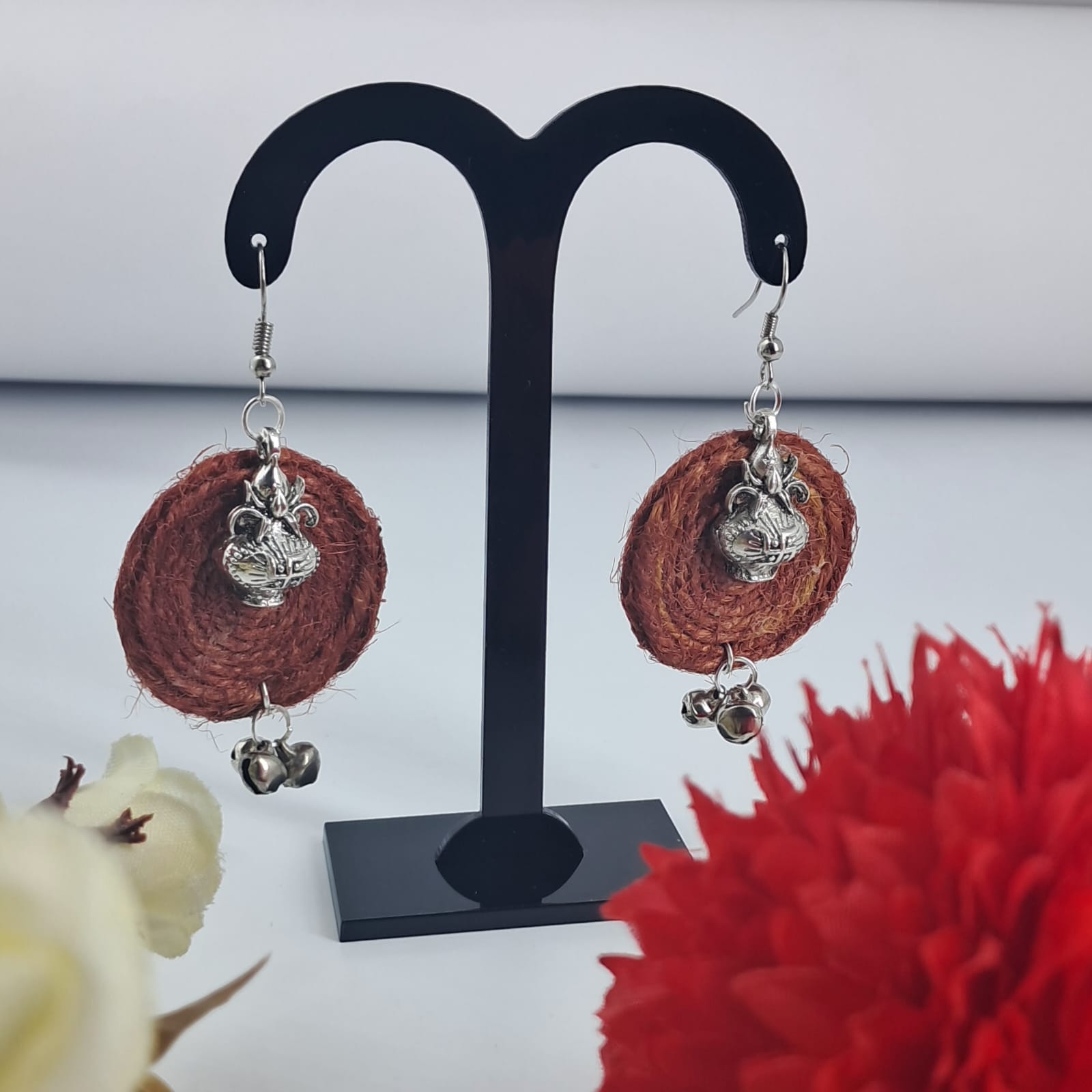 Handcrafted jute disc earrings featuring natural fiber texture and elegant silver-tone charm accents for a stylish, earthy look.