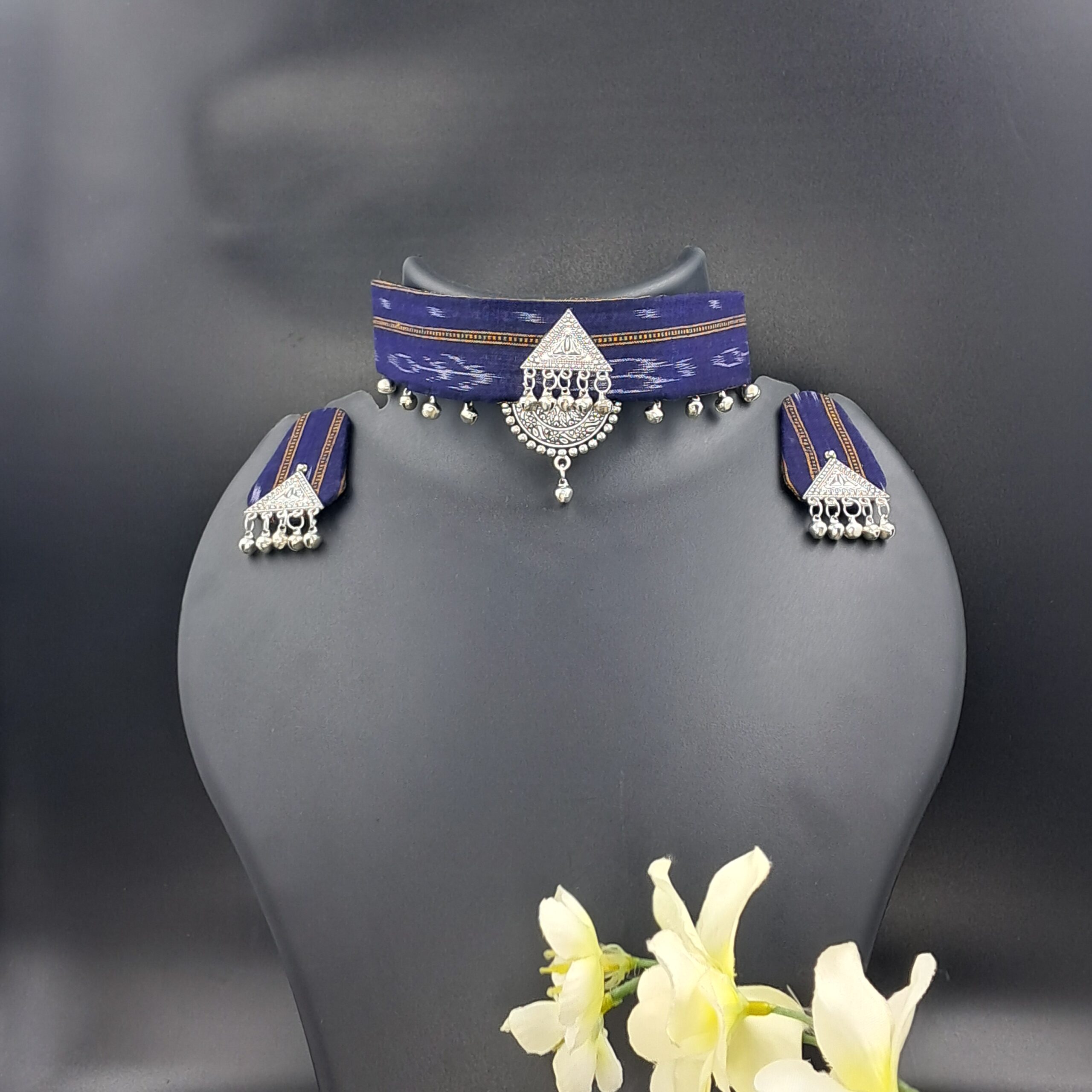 The set includes matching statement earrings crafted with the same Sambalpuri fabric base and tribal-inspired charms, creating a perfectly coordinated accessory set.
